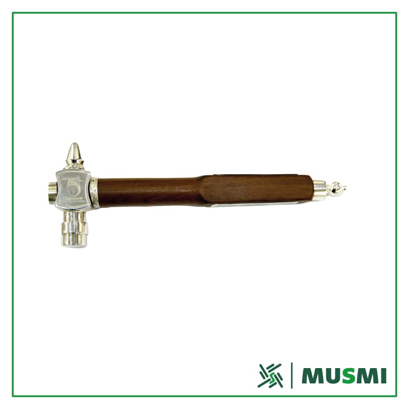 Herramienta artesanal única, conformada por una cabeza de plata grabada con el logo del 75º aniversario de Misioneros de Guadalupe y un mango de madera de Tepehuaje.