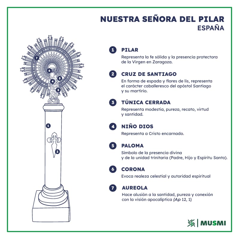 Advocación mariana originada en Zaragoza, España, donde se apareció al apóstol Santiago en el año 40 d.C. mientras predicaba el Evangelio. Este hecho, considerado la primera aparición mariana, marcó un hito en la expansión del cristianismo y consolidó a la Virgen del Pilar como patrona de España y símbolo de la fe hispánica.