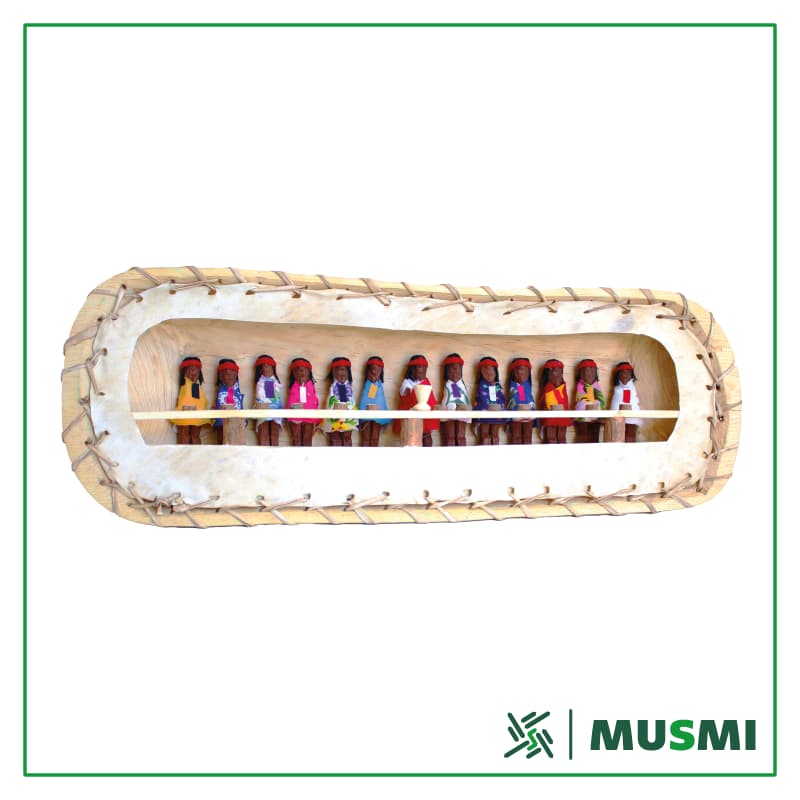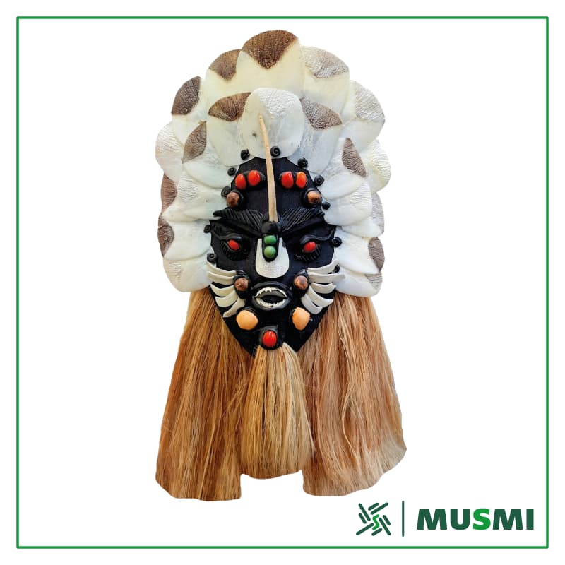 Máscara originaria del puerto de Manaus, en el corazón de la Amazonía, al norte de Brasil. Fue tallada en madera y cuenta con ornamentos de semillas y escamas del pez paiche (una de las especies más grandes de la región y del mundo), y fibras de chambira (palma nativa).