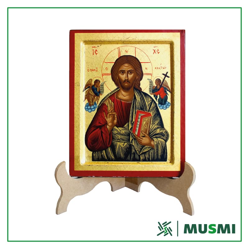 Réplica del Pantocrátor que se encuentra en la Iglesia de Santa Sofía de Constantinopla (actual Turquía), fue donada por Mons. Ilario Antoniazzi, Obispo Emérito de la Arquidiócesis de Túnez al Superior General de MG en octubre 2024. Muestra a Cristo bendiciendo con su mano derecha y sosteniendo el Evangelio con la izquierda.