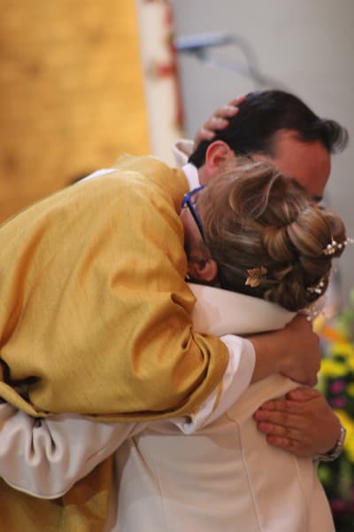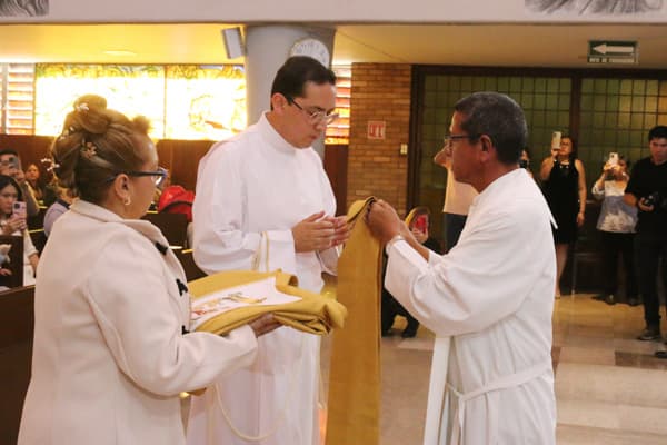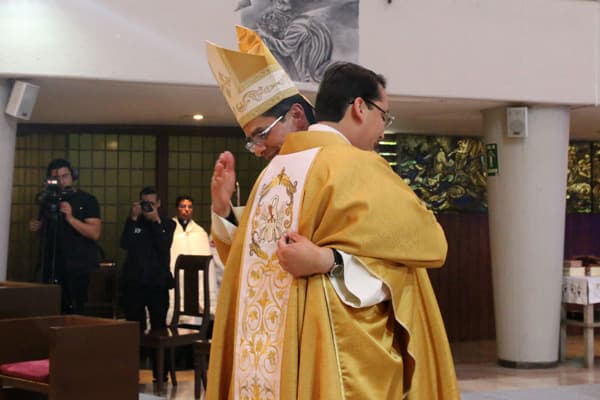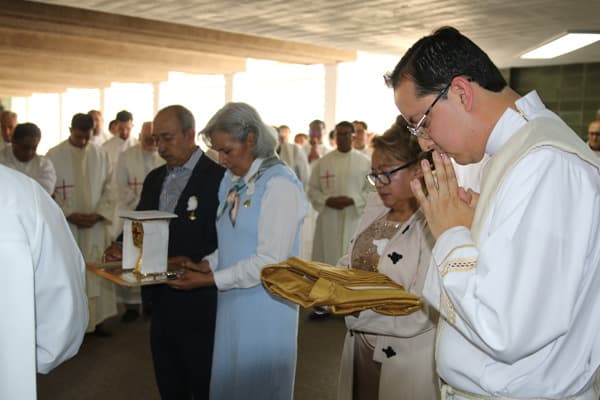Como nuevo sacerdote, el padre Moisés fue revestido con la estola presbiteral y la casulla propias del Orden Sacerdotal por el P. Francisco Flores Muñoz, MG, y su mamá, para después ser presentado a la asamblea; finalmente, Mons. Luis ungió sus manos y le hizo entrega del pan y el vino, símbolos de que ya puede celebrar el Sacramento de la Eucaristía. El rito de la ordenación finalizó con el abrazo de la paz al P. Moisés, que realizó Monseñor y todos los sacerdotes presentes.
