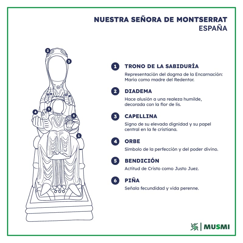 Advocación mariana de tipo toponímicas, venerada en el monasterio de Montserrat, en Cataluña, España. Su culto se remonta al siglo XII y está profundamente ligado a la identidad espiritual y cultural del pueblo catalán. La imagen muestra a la Virgen entronizada con el Niño Jesús en brazos, y es símbolo de protección, fe y tradición.