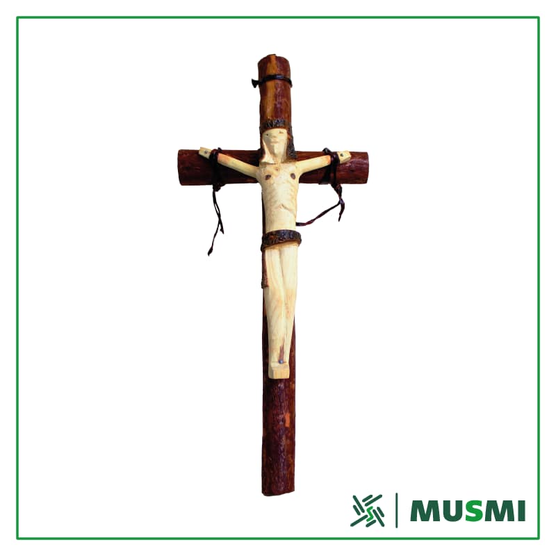 Este crucifijo, tallado en madera de madroño, es una expresión de la artesanía de la Sierra Tarahumara. La calidez y la veta única de la madera se combinan con la sensibilidad artística local para crear una pieza que fusiona la devoción religiosa con la identidad cultural de la región.